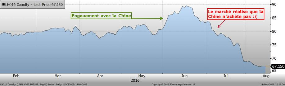Selon moi, il est important de se souvenir de ce qui est arrivé au printemps 2016 : le prix du porc en Chine touchait un sommet à 26 CNY/lb (prix de gros) et le marché boursier à Chicago s’était fortement apprécié grâce aux appréhensions que les Chine allaient acheter beaucoup de porc pour calmer la flambée des prix. Le prix du CàT d’août 2016 avait touché 90 ¢/lb vers la mi-juin! Cependant, quand le marché réalisa que la Chine n’achetait pas plus de viande de l’étranger, le marché s’écroulait passant de 90¢ à 67 ¢/lb sur le CàT d’août… Bref, tout ça pour dire qu’une panique reliée à la PPA pourrait être une bonne opportunité pour vendre 2019 puisque la Chine pourrait absorber la hausse du prix sans importer plus de porc.