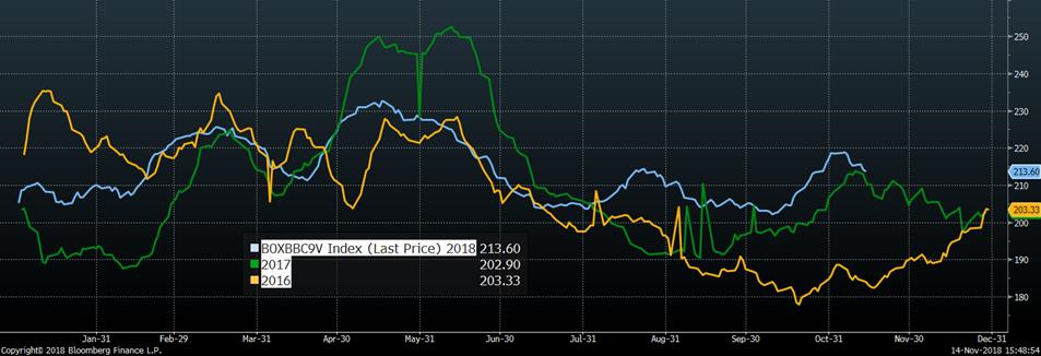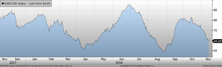 Hier, le porc de décembre gagnait +0.75¢/lb, à 57.30¢/lb. Février prenait également +0.65¢/lb, clôturant à 62.12¢/lb. Aujourd’hui, tous les mois baissent un peu, sauf février et avril qui montaient d’environ +0.3¢. Le marché du porc continue d’être partagé entre l’offre record à court terme et le potentiel haussier pour l’année prochaine, ce qui entraîne de la volatilité sur le marché. En 2019, les exportations américaines pourraient bien explosées si la peste porcine africaine prend de l’ampleur en Chine. Ça reste des « si », car il n’y a aucune garantie que la Chine augmentera ses volumes d’importations ou que la peste porcine africaine affectera la production chinoise.