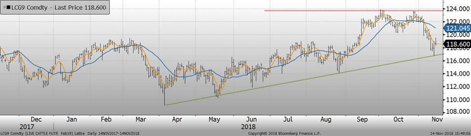 Hier, le bœuf de décembre rebondissait légèrement de son support (+0.45¢/lb) et clôturait la journée à 115.38¢/lb. À court terme, le bœuf de décembre ne devrait pas apporter de grandes surprises alors que l’échéance se rapproche de plus en plus. La journée s’est amorcée avec un mouvement de replis sur décembre, alors que plusieurs positions longues étaient liquidées. Techniquement, le rebond sur le support à 115¢/lb est un signe positif qui consolide ce support. À moyen terme, le marché semble anticipé d’avantage de gains pour février qui grimpait de +0.75¢/lb mardi et baissait de -0.4¢ aujourd’hui, à 118.60.