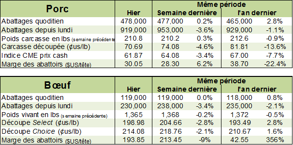 Hier, les abattages étaient estimés à 119 000 têtes, inchangé comparativement à mardi la semaine dernière. Depuis le début de la semaine, les abattages étaient de 238 000 têtes, soit 8 000 têtes de moins que la semaine dernière. Il s’agissait également d’une baisse de -3.0% ou 7 000 têtes par rapport à la même période l’an dernier.