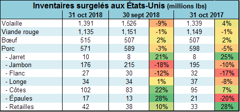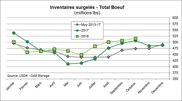 La semaine dernière, l’USDA publiait les inventaires surgelés au 31 octobre. Normalement, à cette période de l’année, on s’attend à une petite augmentation des réserves et c’est ce qu’on a eu… donc pas de surprise. Les inventaires surgelés ont augmenté de 8 millions lbs soit 2% de plus que l’an dernier et le mois précédent. À 515 millions lbs, ce sont les plus gros inventaires depuis janvier 2017 ce qui n’est pas un élément positif pour le prix.