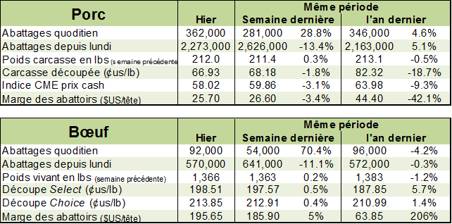 Les abattages étaient de 570,000 bœufs la semaine dernière, soit 11% de moins que la semaine précédente à cause du jour férié de la Thanksgiving. C’était tout de même 5000 têtes que l’an dernier à pareille date. Le poids est de 1366 lbs vivant (environ 826 lbs carcasse) ce qui est plus faible que l’an dernier et explique la baisse de production. Avec 469.7 millions lbs produites, le volume était 2.5% de moins que l’an dernier.