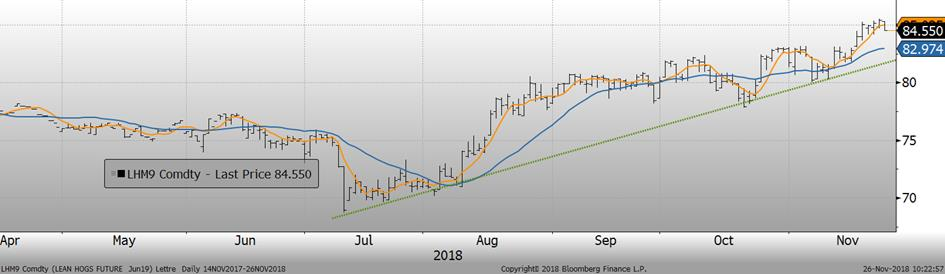 La semaine dernière, l’USDA avait publié les inventaires surgelés lesquelles suggèrent une forte demande pour le mois d’octobre alors que la production était à des niveaux record. Les inventaires surgelés ont baissé de 3% entre la fin septembre et fin octobre, pour s’établir à 571M lbs. Cela représente une baisse de -5% par rapport les inventaires de l’an dernier à l’Halloween. Les principales coupes qui sont en déficit relativement à l’an dernier sont l’Épaule (-20%), le flanc (-17%) et le jambon (-10%). Apparemment, les taxes mexicaines n’affectent plus vraiment la demande au niveau de prix actuel. Avec la réduction des exportations vers la Chine, on note une explosion des stocks de retailles à 42M lbs soit +28%.