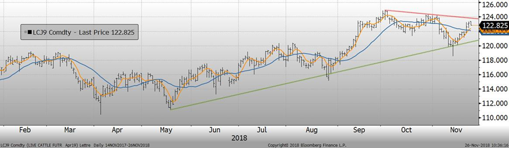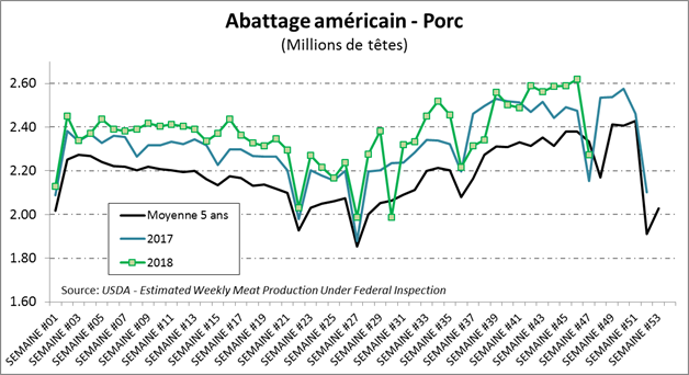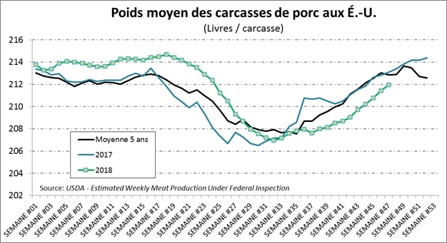 La semaine dernière, les abattages étaient de 2.27 millions têtes, en baisse de 13% versus la semaine précédente en raison du férié de la Thanksgiving. Les abattages étaient tout de même en hausse de +5.6% versus la même semaine en 2017. Le poids de la carcasse continue d’augmenter, mais pas assez pour rattraper la livre de différence avec l’an dernier. En somme, la production hebdomadaire était de 481.8 millions lbs, en hausse de +5.0% versus 2017.