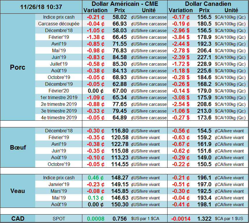 Le marché sur bœuf continue d’afficher une bonne prime versus le marché cash. Au moins, cet écart se rétréci grâce au rebond du prix cash qui était de 116-117 ¢/lb la semaine dernière comparativement à 113¢ la semaine d’avant. Le rapport Cattle-on-Feed est venu donner un coup de pouce au prix et on se dirige vers les sommets du mois d’octobre. De plus, les indicateurs de consommation générale aux É.-U. pour la période des fêtes et une forte demande en provenance de Chine où le prix cash est très élevé sont des facteurs qui devraient venir supporter le prix à court terme.