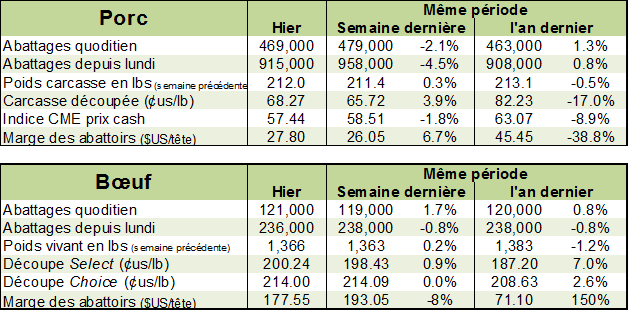 Mardi, l’USDA estimait que les abattages étaient de 121 000 têtes ce qui amenait le total pour la semaine à 236 000 têtes, soit 2000 têtes de moins que la semaine dernière. Le rythme d’abattage était pratiquement inchangé par rapport à l’an dernier (-1000 têtes). Une croissance d’abattage entre +1% et+2% continue de supporter le prix à court terme.