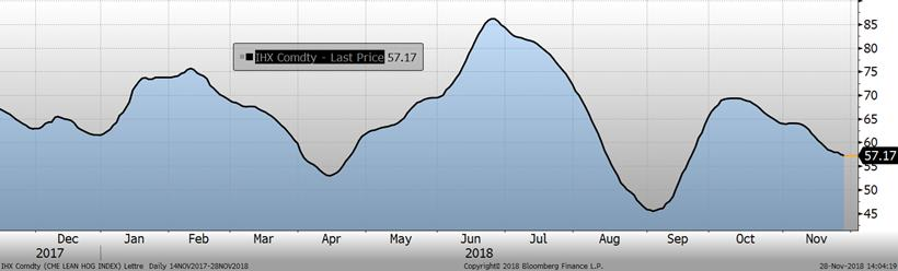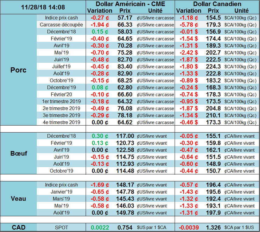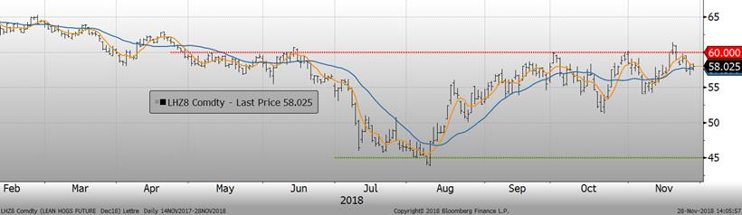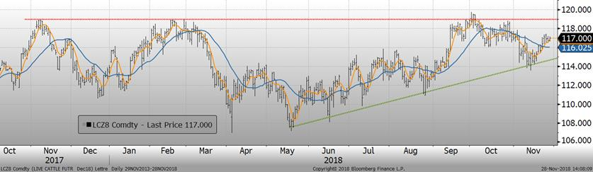 Selon l’USDA, les abattages étaient de 469 000 têtes hier ce qui amène le total pour la semaine à 915 000 têtes, en baisse de 10 000 têtes par rapport à la semaine précédente. Il s’agissait toutefois d’une hausse de +0.8%, ou 7 000 têtes, versus 2017. La pression sur les prix devrait se maintenir si les abattoirs maintiennent leur rythme actuel, alors que la production est généralement à son plus haut de l’année autour de la fête de l’Action de grâce américaine.