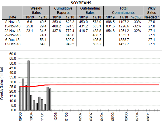Mais : super belle semaine, mieux que prévu même. D’ailleurs c’est une belle progression depuis un mois. Après avoir stallé en octobre c’est bien de voir l’export revenir en force. Le commitment est rendu à 1 milliard de boisseaux, en hausse de 16% par rapport au volume de l’an passé à la même date.