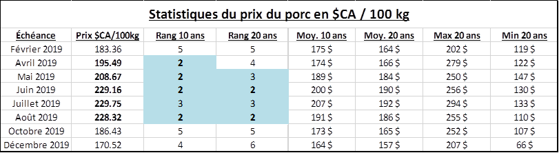 Grâce à la baisse du huard, le prix du porc en $CA/100kg atteint des niveaux historiquement élevés. Les contrats d’avril, mai, juin et août sont les 2èmesplus hauts depuis 10 ans, après les prix de 2014. Depuis 20 ans, les prix de juin et août sont aussi les 2èmes plus haut.