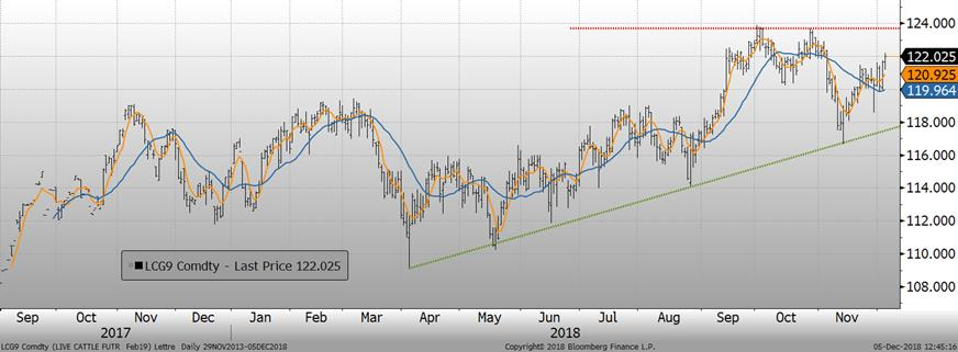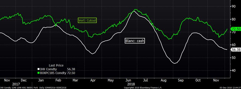 Selon l’USDA, les abattages étaient de 478 000 têtes hier ce qui amène le total pour la semaine à 945 000 têtes, en hausse de 30 000 têtes par rapport à la semaine précédente. Versus 2017, il s’agissait d’une hausse de +1.4%, ou 13 000 têtes. Il est à noter que le marché traverse les hauts de production annuelle et que la production devrait commencer à diminuer au cours des prochaines semaines. Le marché semble espéré que la période de février coïncide avec une ouverture des marchés d’exportation et une demande locale forte stimulée par la baisse du prix des découpes et ultimement du prix au détail. Les consommateurs américains devraient en effet bénéficiés de l’environnement de baisse de prix es dernières semaines d’ici là, alors qu’il existe un certain délai avant que les prix à l’abattoir se reflètent au détail et stimulent la demande.