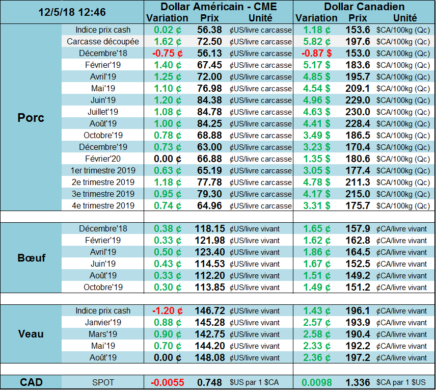 L’indice CME du prix cash pour la journée de mardi était publié à 56.40¢/lb aujourd’hui, en hausse de +0.02¢/lb. Au cours de la dernière semaine, l’indice CME du prix cash a fait du surplace, baissant en moyenne de -0.09¢/lb par jour! Il semble que la réalité a rattrapé le marché avec la baisse des derniers jours. Il reste 8 publications avant l’échéance de décembre qui devait converger vers le cash d’ici là. Dans la les prochaines semaines, le cash sera supporté par la force du prix des découpes et la diminution des abattages, mais le marché est d’avis qu’on manquera de temps pour que ça se passe d’ici la mi-décembre. Le prix des découpes était publié à 70.88¢/lb hier, en hausse de +0.23¢/lb comparativement à 67.74¢/lb la semaine dernière, ce qui a également aider à inverser la direction du cash. Le marge des abattoirs augmente à 34 $US/tête, un nouveau sommet depuis l’été dernier, mais 10 $US/tête de moins que l’an dernier.