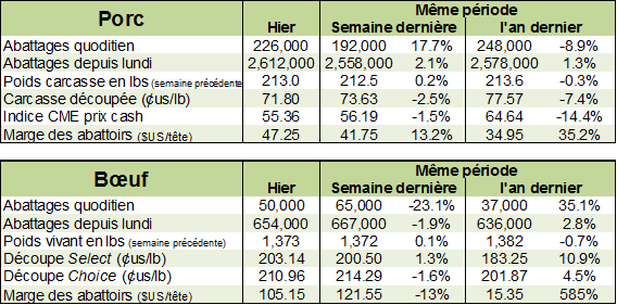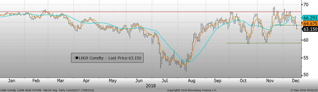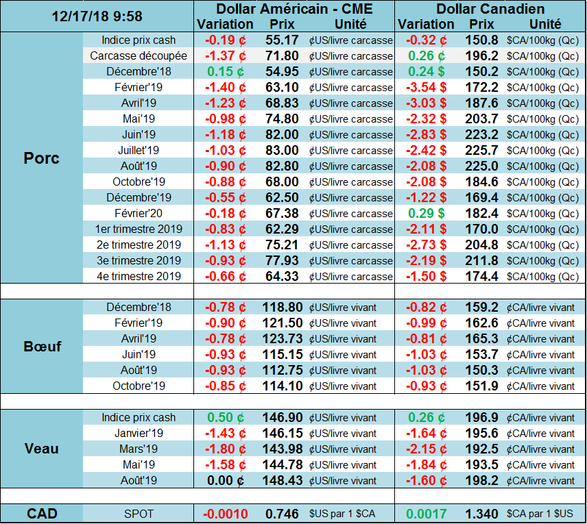 Le marché va porter une attention particulière aux chiffres du rapport Hogs and Pigs de vendredi. Puisque les abattages du 4ème trimestre roulent en-dessous des prévisions au 1er septembre, ce ne serait pas surprenant de voir l’USDA réviser le cheptel légèrement à la baisse. Aussi, selon l’Iowa State University, les éleveurs américains ont seulement connu 2 mois rentable cette année ce qui pourrait ralentir la cadence pour l’augmentation de la production en 2019.