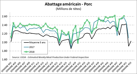 La semaine dernière, les abattages de porc ont surpassé la barre du 2.6 millions de têtes pour une seconde fois, à 2.612 millions, soit 80,000 de moins que le record établit il y a 4 semaines. Historiquement, les abattages de la 2ème semaine de décembre est souvent les plus élevés de l’année, on devrait donc avoir une dernière bonne semaine et après, le volume chutera drastiquement avec des fériés de Noël. Contrairement à la saisonnalité, le poids des animaux a continué d’augmenter ces 2 dernières semaines comparativement à une stagnation ces dernières années. En conséquence, le poids moyen rattrape la moyenne 5 ans à 213 lbs/carcasse et est seulement 0.3% de moins que l’an dernier. En somme, la production était de 556.4 millions lbs, un gain de +1.1% versus l’an dernier.