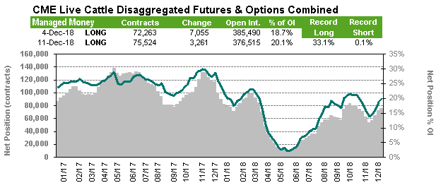 Vendredi, le CFTC publiait les positions des spéculateurs au 11 décembre. On note une augmentation de leur position d’achat par 3261 contrats, pour un total de 75,524 contrats. À l’inverse, les éleveurs/parcs ont vendu 3,626 contrats entre le 5 et 11 décembre, pour un total vendeur de 164,057 contrats.