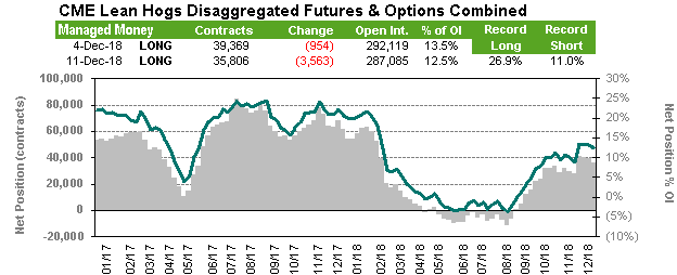 Entre le 5 et 11 décembre, les spéculateurs ont réduit leur position d’acheteur de porc. Durant cette période, ils ont vendu un net de 3,563 contrats pour une position totale à 35,806 contrats. On note que le manque de momentum haussier la semaine dernière à possiblement poussé les spéculateurs à réduire leurs positions.