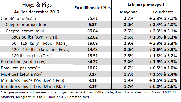 Au 1er décembre, les analystes s’attendent à une croissance du troupeau porcin américain par +2.7% comparativement à +3.0% pour le cheptel de septembre. Toutefois, les chiffres d’abattages du dernier trimestre sont en-dessous des prévisions faites en septembre, on pourrait donc voir une correction à la baisse sur le cheptel du 1er septembre.
