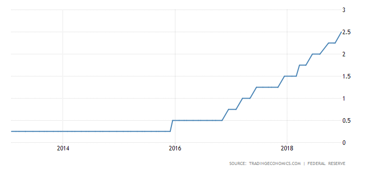 Dollar Canadien s’est replié contre l’USD cet après-midi quand la Réserve Fédérale a annoncé la hausse de son taux directeur à 2.50%. Puisque dans les derniers jours une probabilité non-négligeable s’est installé en faveur du statu quo sans hausse de taux, la nouvelle à 2PM a fait monter la valeur du billet vert (et baisser celle du huard). La réaction du marché est assez cohérente; les taux montent, le dollar américain s’apprécie et les indices boursier comme le S&P500 reculent. La FED dans son communiqué de presse nous informent qu’ils ont revu légèrement à la baisse les perspectives de croissance économie (PIB) pour 2019 ainsi qu’une cible d’inflation un peu plus basse que dans leur dernière projection en septembre. Les américains ont graduellement monté les taux depuis les deux dernières années, eux qui étaient essentiellement à zéro depuis 10 ans. Sur le plus long terme, les taux sont encore « historiquement bas » et le marché s’attend à d’autres hausses en 2019.