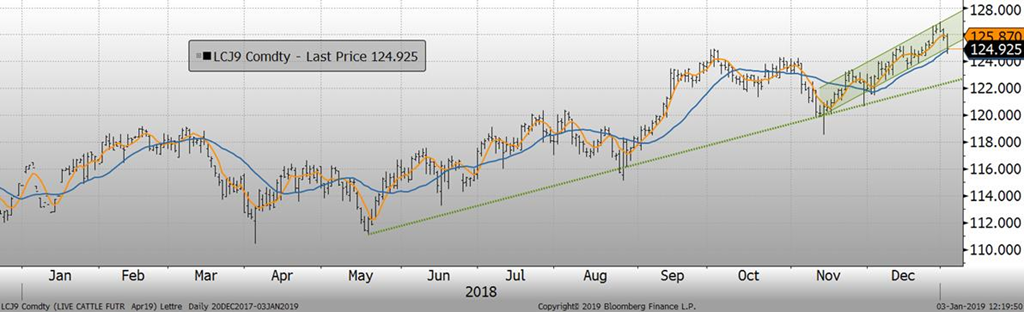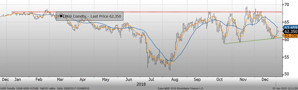 Le marché semble montrer des signes de rebond puisque les traders voient de plus en plus de problèmes quant à la production chinoise. Hier, le plus gros cas de Peste Porcine Africaine en Chine fût rapporté, soit une ferme de 73,000 porcs dont 5,000 étaient infectés pour le virus. Évidemment, pour que ces problèmes deviennent réellement positifs pour le prix américain, il faudrait que les négociations sino-américaines avancent sérieusement et que les tarifs douaniers de la Chine disparaissent en 2019. À l’ouverture d’hier, le marché gagnait plus de 2¢/lb sur février grâce à la nouvelle de la PPA, mais en a reperdu une bonne portion après que l’USDA divulguait le prix cash du 31 décembre… de retour dans le rouge à -0.37¢. Jouant au yo-yo, le prix cash annoncé ce matin remontait de +0.77¢ à 53.58¢. Ça fait déjà plusieurs fois qu’on voit un faux-signal de rebond du cash, mais cette fois-ci, c’est tout de même un gain considérable.