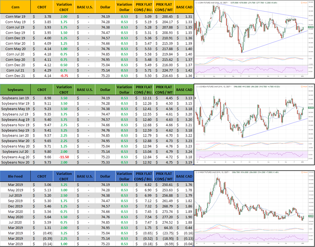 En l’absence de publication de stats d’export, le meilleur proxy c’est de surveiller les bases U.S d’exportations. Aussi les bases comme ça aident à juger la force de l’export, et possiblement la sensibilité des Chinois face à la récolte au Brésil que est peut-être moins bonne que prévue. On se débrouille avec le système D comme dirait grand-père. Elles ont remonté dans les dernières semaines, mais demeurent faibles si on compare aux moyennes des 5 dernières années. Actuellement le golfe est à +20-25 cents pour janvier (3 janvier 2019). Les basis de corn sont plus solides à 38-47 spot.