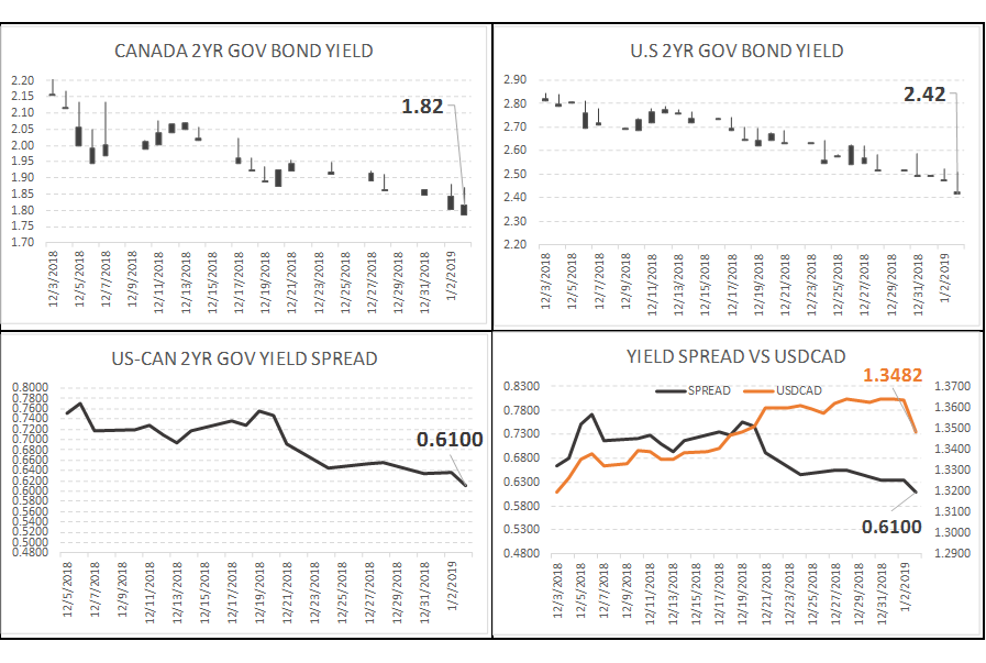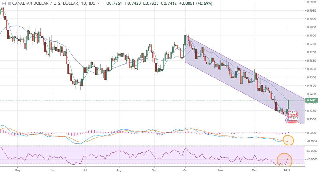 Le CAD qui est dans une tendance négative assez claire depuis octobre semble vouloir montrer des signes de renversement. Je surveille le MACD et RSI qui tourne. Un croisement des moyennes mobiles ainsi qu’une sortie du canal baissier serait très positif pour l’analyse technique. Les banques canadiennes misent toujours sur une appréciation du huard, mais ils doivent défendre leur prévision depuis 3 mois maintenant. La force du dollar cad est plus le contre coup de la faiblesse du dollar américain alors que les économistes et participants du marché misent sur un arrêt complet des hausses des taux pour 2019. Même que la courbe des taux d’intérêt suggère des possible baissent des taux – le monde à l’envers de ce qu’on a vu depuis un an. Ça fait 10 ans maintenant que l’économie américaine progresse tant au niveau de l’emploi que du PIB et la hausse des taux était inévitable… mais évidemment cela apporte son lot de complication comme le replis des indices boursier Dow Jones ou SP500.