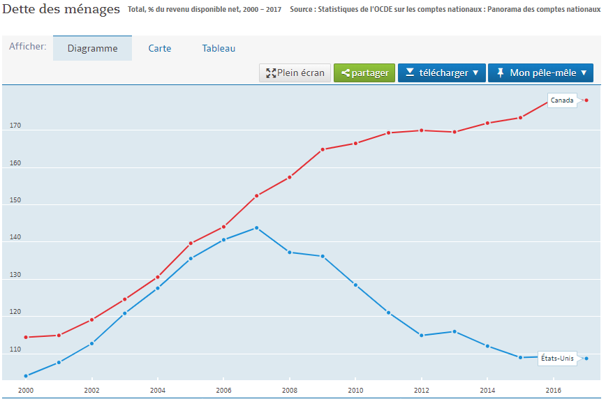 Je pense que le ralentissement (ou l’arrêt complet) des hausses de taux d’intérêt aux USA doit faire le bonheur de la Banque du Canada qui dit vouloir maintenir un écart « raisonnable » entre les taux canadiens et américain. Pourquoi je dis ça? L’endettement au Canada est spectaculaire, mais pas dans le bon sens…. La dette des ménages est extrêmement élevée (178% du revenu disponible – pour chaque 100$ de revenu on en doit 178$, ouin…), ce qui rend les canadiens beaucoup plus vulnérable que les américains. Jusqu’à la crise financière de 2008, le Canada et les USA avait un endettement similaire, mais depuis 10 ans et des taux essentiellement à zéro les canadiens en ont profité pour consommer à crédit tandis que les américains ont resserré l’accès au crédit.