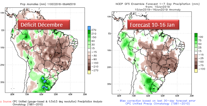 Entre temps les perspectives du mois de NOV/DEC de récolte géante au Brésil se calment car depuis quelques semaines il manque d’eau. Les prévisions actuelles sont rendues à 118 million de tonnes, un léger recul par rapport à l’an dernier mais il y a deux mois il était possible de voir du 123-125 MMT. Dans son dernier rapport l’USDA met la prod à 122 MMT. Certains pensent que 118 pourrait être optimiste, mais je ne m’avance pas.