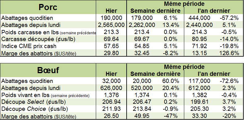La faiblesse des prix de cette semaine s’explique par un manque de momentum sur le marché cash et des découpes. Après quelques bonnes journées de hausse, le prix cash a ralenti à seulement +0.13 et +0.21 ¢/lb pour les ventes de mardi et mercredi respectivement. Le prix cash du porc est présentement 20% de moins que l’an dernier… la pression des taxes du Mexique continue à se faire ressentir sur le prix américain. De même que les découpes qui sont 14% plus faible, incapable d’entamer une tendance haussière, oscillant autour de 70 ¢/lb depuis déjà quelques semaines.