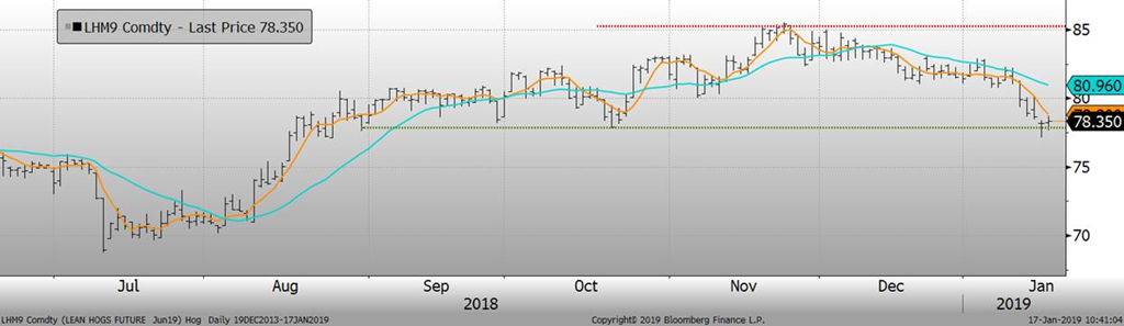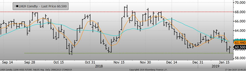 Hier, le prix du porc a connu une sévère correction, perdant plus de 2 @/lb sur les échéances les plus rapprochées. Sur l’ensemble des mois, les prix sont allés rejoindre les bas d’octobre et novembre qui est le support technique. Toutefois, c’est le dernier support que les prix ont avant le creux atteint en juillet 2018, environ 8 ¢/lb plus bas. Il faut s’attendre à ce que plusieurs ordres « stop » de vente se trouvent en-dessous du support ce qui pourrait causer une accélération de la baisse en-dessous de 59.50 ¢/lb sur février et 77.50 ¢ sur juin.