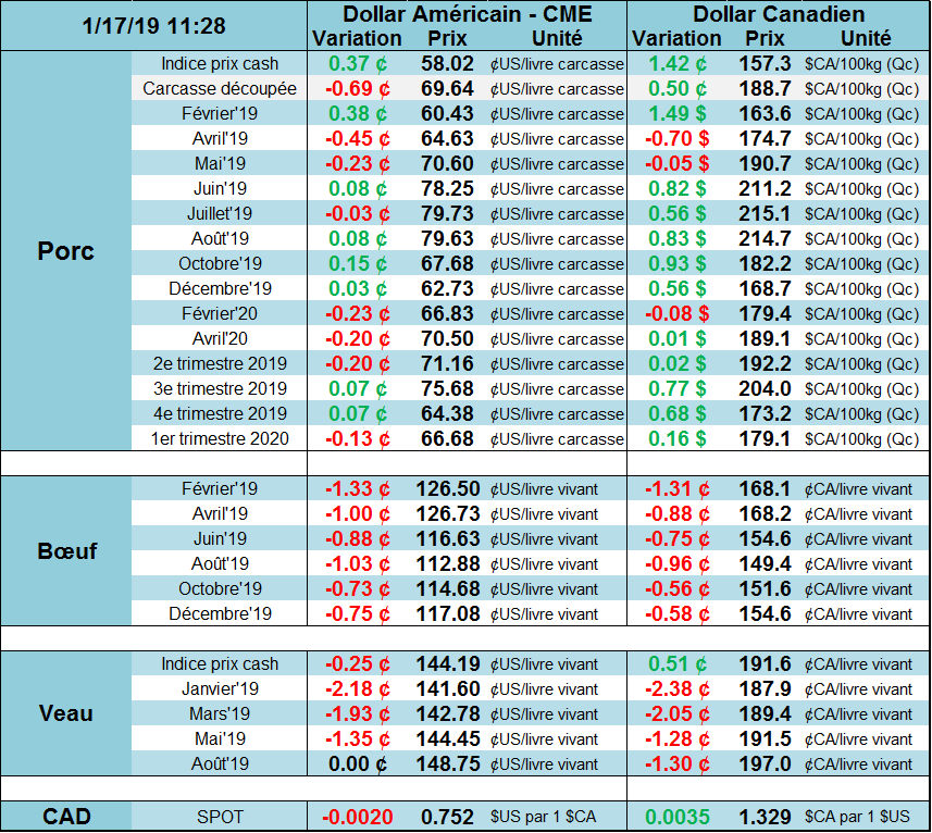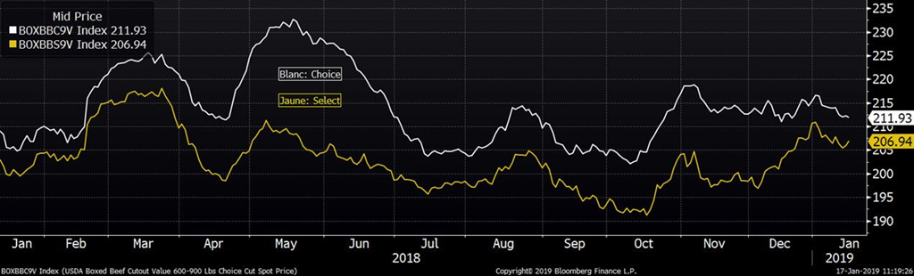 Après une semaine de stabilité près de 125 ¢/lb sur février, le prix a gagné 3 ¢/lb en combinant mardi et mercredi. Évidemment, lorsque nous sommes à deux semaines du début des livraisons physiques, le prix du contrat de février reflète les variations du cash. Bien qu’il y a peu de transactions rapportées, on note que les parcs d’engraissement ont réajusté à la hausse leur prix demandé à 127-130 ¢/lb. DTN rapporte quelques transactions au Nebraska à 197 ¢/lb carcasse (environ 126.50¢/lb). Le prix des découpes Select ne bouge pas beaucoup depuis une semaine à 207 ¢/lb alors que le prix du Choice continue à baisser, présentement à 212 ¢/lb. Les prix sont tout de même 3 à 4% de plus que l’an dernier. La météo pour la fin du mois s’annonce plus froide qu’à la normale aux États-Unis, environ 15 à 25 degré Fahrenheit sous la moyenne. Cette température devrait restreindre la prise de poids des animaux ces deux prochaines semaines, d’où la force du prix cash ces derniers jours.