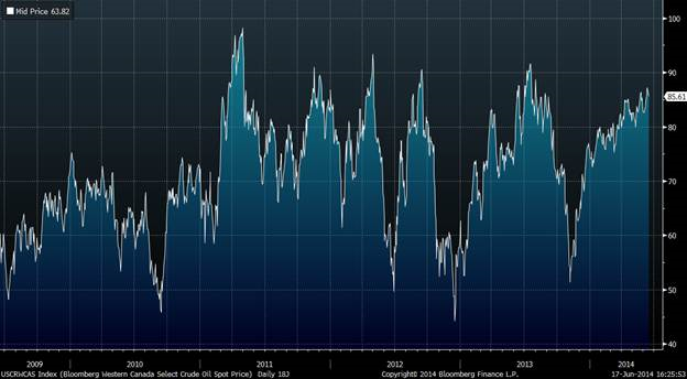 Avec les conflits en Iraq, le cours du baril de pétrole a augmenté de 4% à New York depuis le début du mois. En conséquence, la valeur de notre pétrole en provenance des sables bitumineux s’est également appréciée, maintenant à 85.60 $US le baril (graphique 1). La logique économique veut que lorsque la valeur d’une matière première exportée augmente, cela nécessite plus de dollar canadien aux acheteurs étrangers pour acquérir la même quantité, faisant ainsi augmenter la demande de dollar canadien sur les marchés de changes. Comme dans les commodités, lorsque la demande augmente et que l’offre reste stable, les prix montent, ce qui explique pourquoi le dollar canadien s’appréciait lorsque le prix du pétrole montait. Par contre, il faut noter que cette relation n’est plus comme avant et est pratiquement nulle depuis plusieurs mois.
