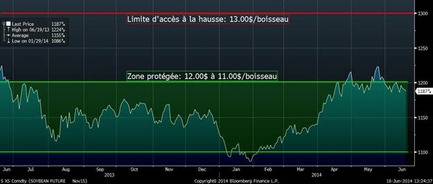 Soya : +10 ¾ à 14.09 sur juillet et +1 à 12.13 sur nov. 2014