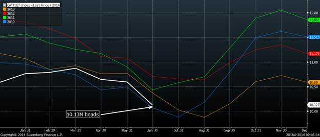 À la fermeture de vendredi, l’USDA publiait les données en parcs d’engraissement au 1er juillet lesquelles démontraient un plus petit troupeau qu’espéré, ce qui devrait continuer à supporter les prix du bœuf pour 2014. Au 1er juillet, il y avait 10.13 millions de bêtes dans les parcs, soit -2.4% par rapport l’an dernier, en dessous des estimés de -1.9% (graphique 1). Cela devrait engendrer une offre plus faible dans la période des fêtes où la demande est relativement forte. Cependant, l’attention se concentrait sur les placements lesquels restent très faibles, ce fût les plus petits placements depuis 2009 pour un mois de juin à 1.49 million de têtes, en baisse de 6.2%. En plus de placer moins de bêtes en parc, ils sont plus légers ce qui étira la période de commercialisation dans quelques mois. Les placements de veaux en dessous de 600lbs ont augmenté de 13% depuis un an, comparativement à une baisse de 14% dans les 700lbs et plus. Par ailleurs, dans le sondage semi-annuel d’inventaires bovins, on y trouvait le cheptel de veaux qui est 2.1% plus faible que 2012 à 4.1 millions de têtes : le processus d’expansion des troupeaux est relativement lent et l’offre de bovin d’engraissement (feeder) devrait rester serré jusqu’en 2016. En raison de cette faible expansion, le prix du feeder continue son ascension avec un gain de 2¢/lb aujourd’hui, franchisant un nouveau record à 2.20$/lb, une hausse de 44% depuis les 12 derniers mois (graphique 2). En plus du fondamental très positif pour le prix du feeder, la tendance reste extrêmement forte. Tel que nous l’avons déjà précisé, protéger ses achats futurs de bovin semble très intéressant pour les prochains mois.