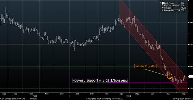 Maïs: +3 ¾ à 3.65 ¾ sur septembre et +3 ½ à 3.77 sur déc. 2014