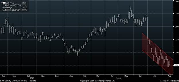 Le prix du blé a terminé la semaine sur un ton positif après que la tension monte entre l’Ukraine et la Russie, créant de l’incertitude face aux exportations futures de la région de la Mer Noire. Sinon, les marchés de grains continuaient de digérer le rapport de l’USDA ce qui a permis un rebond de presque 4% du prix du maïs cette semaine, une première depuis un bail. Rappelons-nous que les projections de rendement de maïs étaient sous les estimés à 167.4 boisseaux/acre, mais reste tout de même un rendement record. Techniquement, le prix a rebondit de son support à 3.63$/boisseau, mais reste encore dans sa tendance baissière, on ne peut pas encore parler d’un revirement de tendance (graphique 1). Le prix devra d’abord surpasser le « gap » formé le 21 juillet (à 3.78$) ce qui correspond à un point de résistance où est le prix en ce moment. Pour le soya, le prix reste très faible au tour de 10.50$/boisseau pour novembre puisque la météo ne cause pas problème pour le développement de la plante. Le prix reste dans sa tendance baissière et est incapable de former un support (graphique 2) ce qui laisse croire que le prix du soya est plus vulnérable à court terme que celui du maïs.