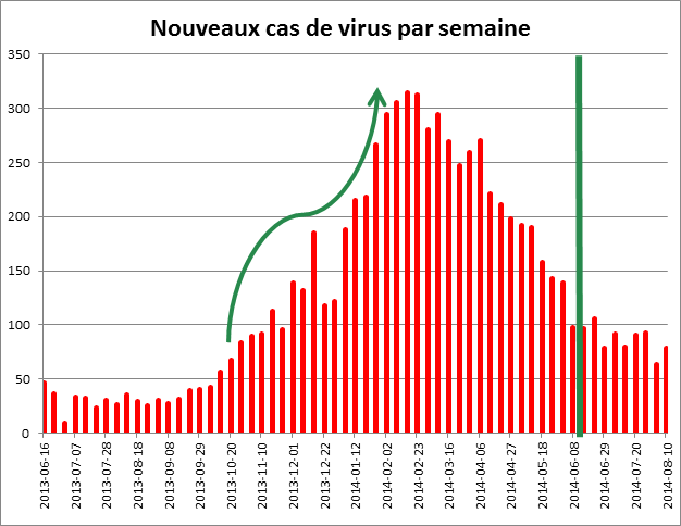 Depuis quelques semaines, la propagation du virus de la Diarrhée Épidémique Porcine se fait discrète sur les fils de presse, mais on note toujours de nouveaux cas aux États-Unis et ailleurs dans le monde. Aux États-Unis, les nouveaux cas d’infection sont plutôt stables, juste sous de la barre des 100 cas par semaine, mais la situation ne semble plus s’améliorer depuis le début de l’été (graphique 1). On s’attendait déjà à ce que le nombre de cas diminue durant la période estivale puisque le virus se propage difficilement lorsqu’il fait chaud et sec…. Mais qu’arrivera-t-il lorsque la température chutera à l’automne? Évidemment, personne n’a une boule de cristal, mais on pourrait voir un accroissement des cas à partir d’octobre si l’histoire de 2013 se répète. Ce sera à suivre, mais l’arrivé de l’hiver aidera la propagation du virus ce qui pourrait causer une hausse des prix pour les livraisons de l’été 2015 qui sont actuellement à 93¢/lb en moyenne. Selon le directeur de gestion des risques de h@ms Marketing Services, l’histoire du virus pourrait se répéter cette année ce qui permettrait aux producteurs de fixer des profits intéressants pour 2015 durant l’hiver.