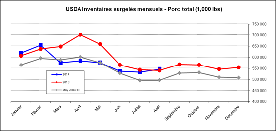 Aujourd’hui, nous discuterons des nouvelles estimés d’Informa Economics qui prévoit moins d’acréage dans le maïs pour la récolte actuelle et des superficies à 87 millions d’acres autant pour le maïs que le soya l’an prochain (et oui, moitié-moitié!). De plus, il y avait le rapport sur les inventaires surgelés d’août cet après-midi : pour la première fois depuis février les inventaires de porc sont plus élevés qu’en 2013. Les inventaires de bœuf continuent à se rétrécir atteignant son plus bas niveau depuis mai 2005.