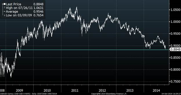Le taux CAD/USD a baissé de 80 points pendant la séance d’aujourd’hui, entrainé par la chute du prix du baril de pétrole à New York et à Calgary. Le prix du pétrole brute américain est à son plus bas niveau depuis 28 mois à82.12$/baril alors que celui des sables bitumineux albertains a également baissé de 4% à 69.30$/baril. La contraction du prix de l’énergie est principalement due à des perspectives de croissance mondiale plus faible qu’anticipées il y a quelques mois ainsi qu’une production mondiale qui bat à plein régime. Techniquement, le dollar canadien n’est plus supporté et reste dans une tendance baissière depuis 2012 ce qui pourrait être risqué pour les acheteurs de grains.