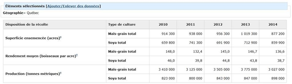 Tableau QUÉBEC pour le maïs-grain et le soja : Pire rendement en 5 ans dans le soja, avant dernier dans le corn.