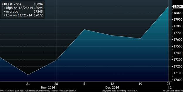 Nous avons vu la production d’éthanol depuis le début du mois de novembre à de hauts niveaux grâce à des marges de production très élevées, cependant une partie de cette production se retrouve dans une augmentation des inventaires. Bref, la surproduction n’est pas consommée et l’excédent est stocké. Il faudra voir si la baisse des prix de l’essence stimulera suffisamment les automobilistes à parcourir plus de kilomètre.