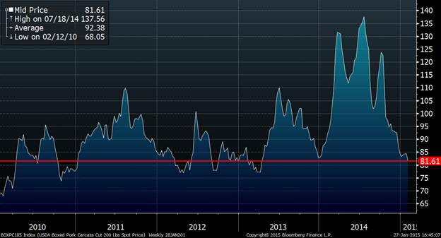 A 72.91 $/100lbs, l’indice des prix cash est 5.65 cents plus faible que la moyenne des 5 dernières années et sa trajectoire est négative alors que la saisonnalité du marché suggère une hausse. L’indice risque de continuer sa baisse avec l’ajout de la donnée d’aujourd’hui. Le prix moyen négocié pour la carcasse a été de 66.93 $/100lbs, en baisse de 0.99 cents par rapport à hier (http://www.ams.usda.gov/mnreports/lsddhps.pdf).