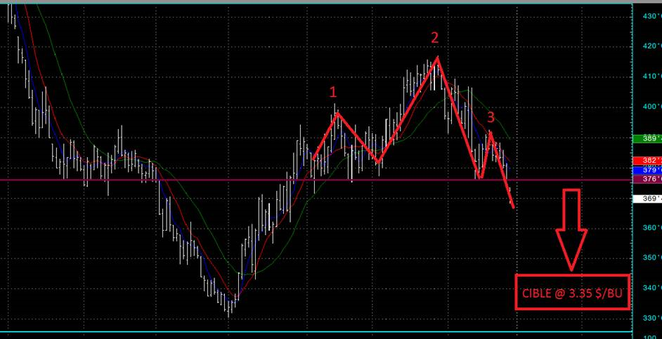 Techniquement donc, les prix pourraient chuter à 3.35 $/bu (375 – 40 = 335)