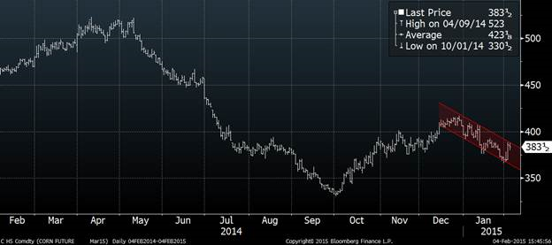 Maïs: - 2 ¼ à 3.83 ½ sur mars’15 et -2 à 4.14 ¼ sur déc’15