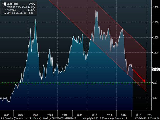 Le prix du soya pour la nouvelle récolte continue de baisser et la tendance est négative depuis la brisure de la ligne de support le 13 janvier dernier suite à la publication du dernier rapport de la USDA. Le volume sur la cassure avait été très important également confirmant ainsi le mouvement.