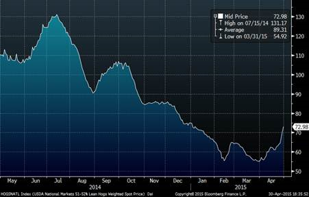 La récente baisse du dollar américain est-elle la cause de l’augmentation de 14% du prix au comptant du porc cette semaine aux États-Unis ? Après 3 cents d’augmentation hier, on constate une forte hausse encore aujourd’hui de 2.7 cents ! Le prix de toutes les coupes de porc était à la hausse aujourd’hui également. Il y a de plus en plus de cas de grippe aviaire aux États-Unis et cela va probablement motiver le consommateur à manger autre chose et possiblement plus de porc.