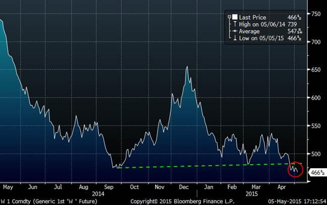 Le prix du blé était très faible à l’ouverture ce matin. L’Égypte a confirmé des achats importants à la Russie. Cela confirme que le blé américain n’est pas compétitif et les ventes à l’exportation seront possiblement révisées à la baisse. La tendance n’est pas trop forte comme vous pouvez le constater dans le graphique plus bas.