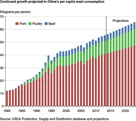 Selon Jim Long, le spécialiste du porc chez Genesus, les inventaires de truies en Chine seraient maintenant de seulement 40.42 millions en baisse de 7.5 millions depuis un an et il faut retourner à 2003 pour retrouver un inventaire aussi faible ! Au cours des 10 dernières années, la consommation de porc à littéralement explosée en Chine comme vous pouvez le constater dans le graphique plus bas. La USDA estime également que la demande continuera probablement d’augmenter au cours des prochaines années. Quand on pense que ça prend environ 2 ans avant de pouvoir augmenter la production et que les abattages de truies continuent supposément à un rythme de 700,000 par mois, il va bientôt manquer beaucoup de porcs pour nourrir tous les chinois !