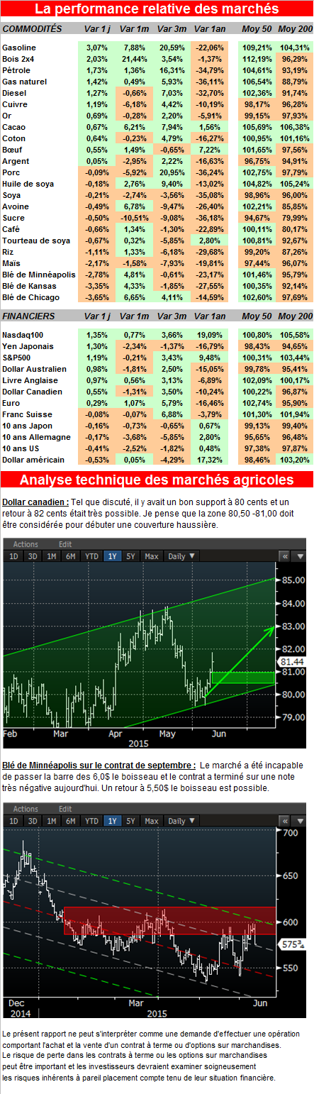 La demande pour le soya est un peu plus forte que prévu et les inventaires de fin d’année 2015/16 devraient être de 475 millions de boisseaux comparativement à des estimés de 500 millions le mois dernier. Les inventaires mondiaux de maïs anticipés pour la fin de l’année 2014-2015 risquent d’augmenter de 2.3% à 197.01 millions de tonnes. La production au Brésil a été révisée à 81 millions de tonnes en hausse de 3 millions par rapport au dernier mois. Il est à noter que le Brésil produit maintenant 8.1% du maïs mondial après les États-Unis avec 36% de la production et la Chine à 21%. Au Canada, notre production représente 1.15% du totale avec 11.5 millions de tonnes.