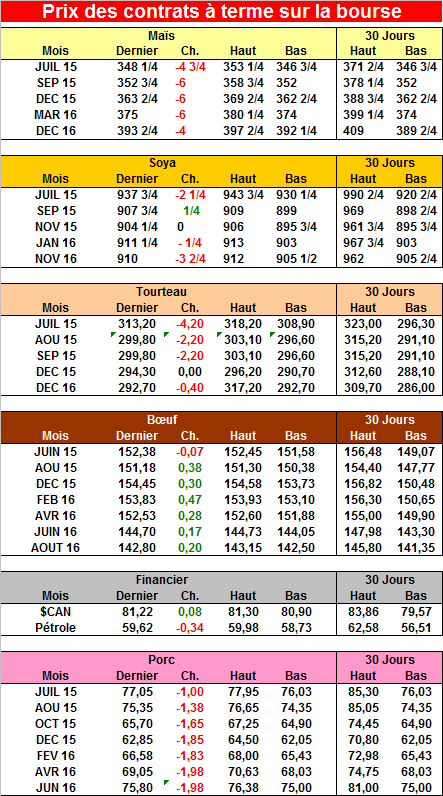 La nouvelle vendredi que la Russie et la Roumanie avaient vendu au total 180,000 tonnes de blé à l’Égypte démontre que le prix américain est trop élevé et les ventes à l’exportation risquent de diminuer encore. Le rapport de la USDA, la semaine dernière, avait rappelé au marché que les inventaires mondiaux de grains sont élevés et que, par conséquent, la compétition risque d’être très féroce pour s’accaparer les parts de marchés.