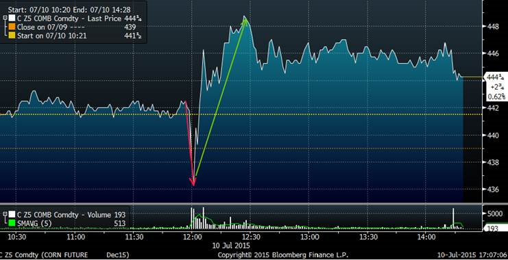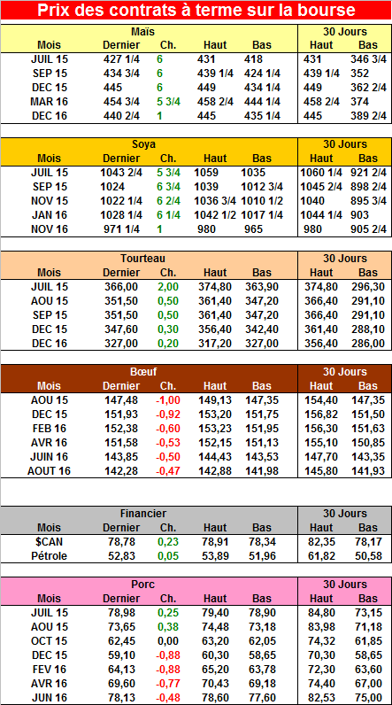 La USDA a décidé d’attendre le mois prochain avant de changer ses estimés concernant les rendements estimés pour le maïs et le soya. Par conséquent, les inventaires estimés pour la fin d’année 2015/16 étaient plus élevés que le marché l’avait anticipé et la réaction initiale a été négative sur le prix du maïs (voir graphique). Le marché a ensuite remonté de 12 cents sur la perception que la USDA va surement réajuster les rendements plus rapidement le mois prochain. Il y a toujours beaucoup de précipitations d’annoncées et le rapport de lundi prochain après la fermeture sur les conditions des récoltes sera très important à surveiller.
