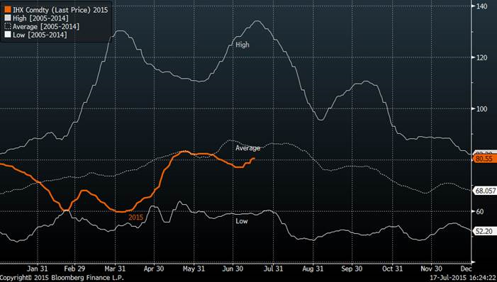 Regardons en moyenne ce que le comptant a tendance de faire entre la mi-juillet et la mi-octobre. La moyenne depuis les 10 dernières années est de -10%. Le contrat d’octobre 2015 anticipe maintenant une baisse du comptant de 21.2%!